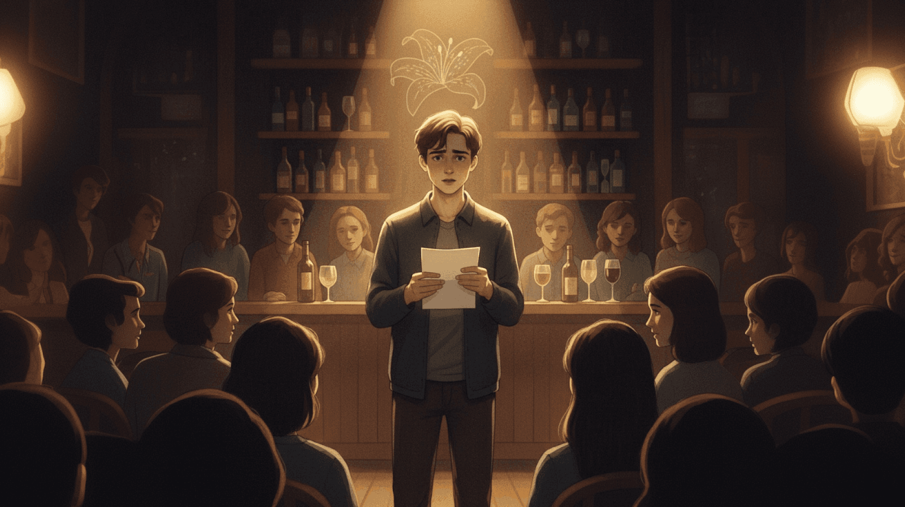 По времени я успевал прочитать стихотворения четыре. С каждой новой строчкой голос становился громче и увереннее, я смог даже бросить пару улыбок в зал. Самое важное, самое значимое и любимое стихотворение я оставил напоследок. Оно было сюжетным: о том, как двое друзей сидели и смотрели в окно на ночной город. Они видели, как бродит по тёмной тропе бедная женщина, как на собственную тень кричит дрожащий пьянчуга. Сама картина этого города была порочной, где-то – грязной. Но там, среди мрака, прорастал яркий огненный цветок: «У трактира, как знак чистоты, красоты и добра, вновь цветёт куст тигровых, почти пламенеющих, лилий».