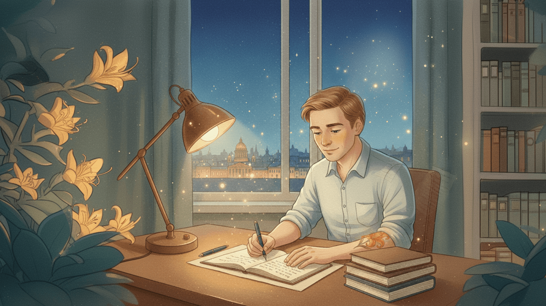Сейчас мне уже двадцать семь. Тот восемнадцати-девятнадцатилетний мальчишка остался далеко позади, я уже не выступаю. Но если я скажу, что выступления никак на меня не повлияли, просто бесстыдно солгу. В конце-концов, та первая открытая книга, те вечера за бабушкиными томами классики, те первые неуверенные шаги на сцене определили мой путь. Я не пошёл учиться на филологический, как собирался в конце школьных лет, а поступил на театральную культурологию, где вместо курсовых работ – настоящий спектакль, а вместо обычной университетской аудитории – лекции под огромными сводами Эрмитажа. Моя работа напрямую связана с написанием и редактурой текстов. Поэтому я смело могу сказать, что тот восторг от первого стихотворения про ангелов пронёс через всю жизнь – до цветущей на коже тигровой лилии, творческой работы. Но самое главное, что и направило меня по этому пути – пример, живой пример моей бесконечно талантливой семьи. Кто знает: может, не найди я те тетради, и не загорелся бы писательством и поэзией, не совершил бы первых неловких попыток, не нашёл бы сцену и своего зрителя. Только благодаря тому толчку я стал тем, кем являюсь сейчас. И буквы – далеко не единственная моя страсть. Я подсознательно тянусь к любому творчеству, будь то вышивка или вязание. Не в самом техническом процессе дело, а в создании чего-то нового: неважно, стихотворение это или вышедший из-под вязального крючка шарф.