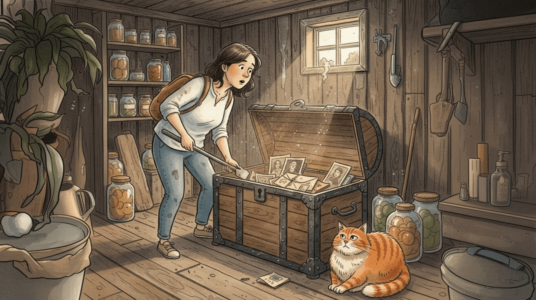 The cellar was, as expected, dark and damp. It smelled of earth, old wood, and... history. It held more than just rows of jars filled with cherry and currant jam. In the far corner, I spotted an old chest bound with tarnished metal strips.